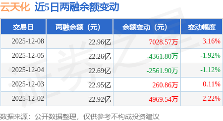 证券之星消息,12月8日,云天化(600096)融资买入2.66亿元,融资偿还1.96亿元,融资净买入7017.98万元,融资余额22.89亿元,近20个交易日中有12个交易日出现融资净买入。