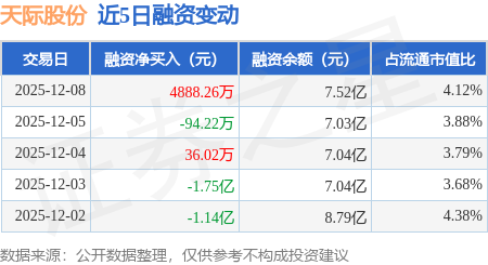 证券之星消息,12月8日,天际股份(002759)融资买入2.62亿元,融资偿还2.13亿元,融资净买入4888.26万元,融资余额7.52亿元。