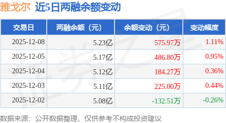 证券之星消息,12月8日,雅戈尔(600177)融资买入1741.85万元,融资偿还1154.56万元,融资净买入587.28万元,融资余额5.06亿元,近3个交易日已连续净买入累计1088.6万元。