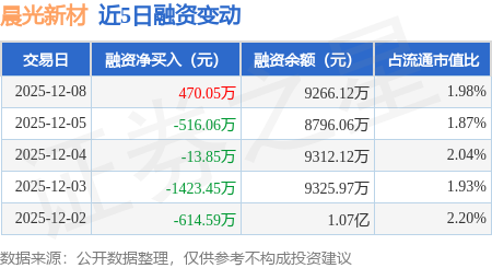 证券之星消息,12月8日,晨光新材(605399)融资买入1671.29万元,融资偿还1201.24万元,融资净买入470.05万元,融资余额9266.12万元。