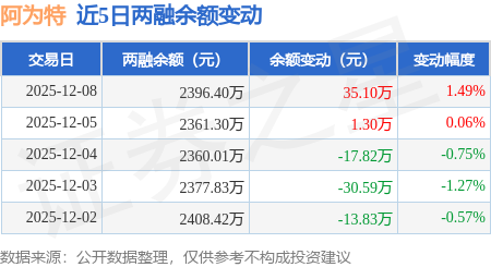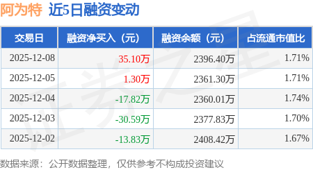 证券之星消息,12月8日,阿为特(920693)融资买入107.37万元,融资偿还72.27万元,融资净买入35.1万元,融资余额2396.4万元。