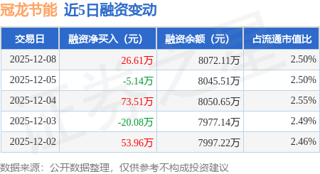 证券之星消息,12月8日,冠龙节能(301151)融资买入249.78万元,融资偿还223.18万元,融资净买入26.61万元,融资余额8072.11万元。