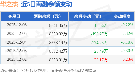 证券之星消息,12月8日,华之杰(603400)融资买入251.69万元,融资偿还270.24万元,融资净卖出18.56万元,融资余额8341.36万元。