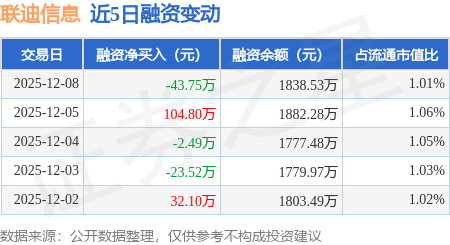 证券之星消息,12月8日,联迪信息(920790)融资买入165.52万元,融资偿还209.27万元,融资净卖出43.75万元,融资余额1838.53万元。