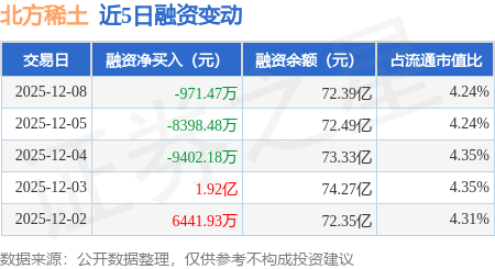 证券之星消息,12月8日,北方稀土(600111)融资买入4.26亿元,融资偿还4.36亿元,融资净卖出971.47万元,融资余额72.39亿元。