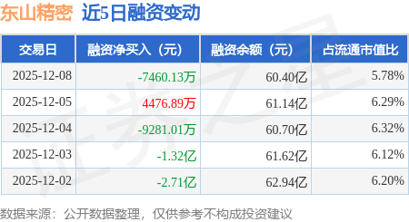证券之星消息,12月8日,东山精密(002384)融资买入7.36亿元,融资偿还8.1亿元,融资净卖出7460.13万元,融资余额60.4亿元。