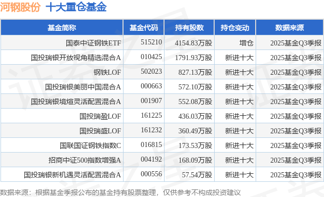 根据2025基金Q3季报公募基金重仓股数据,重仓该股的公募基金共12家,其中持有数量最多的公募基金为国泰基金的国泰中证钢铁ETF。国泰中证钢铁ETF目前规模为36.6亿元,最新净值1.4736(12月8日),较上一交易日下跌0.34%,近一年上涨16.48%。该公募基金现任基金经理为吴中昊。吴中昊在任的基金产品包括:国泰中证500指数增强A,管理时间为2022年1月28日至今,期间收益率为25.09%;国泰中证内地运输主题ETF,管理时间为2022年11月30日至今,期间收益率为-3.46%;国泰沪深300指数增强A,管理时间为2022年12月30日至今,期间收益率为18.3%;国泰国证新能源汽车指数C,管理时间为2022年12月30日至今,期间收益率为12.75%。