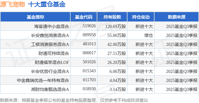 重仓源飞宠物的公募基金请见下表: