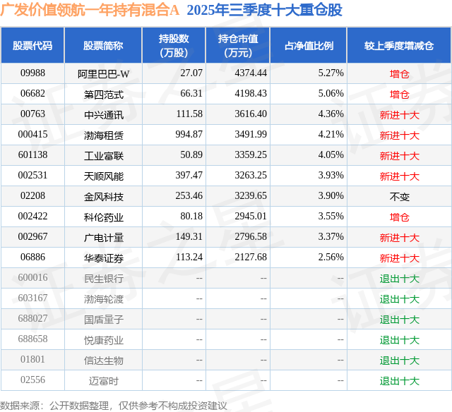 广发价值领航一年持有混合A的前十大重仓股如下: