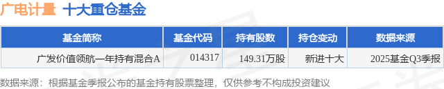 根据2025基金Q3季报公募基金重仓股数据,重仓该股的公募基金共1家,其中持有数量最多的公募基金为广发基金的广发价值领航一年持有混合A。广发价值领航一年持有混合A目前规模为6.65亿元,最新净值2.0907(12月8日),较上一交易日上涨0.72%,近一年上涨63.22%。该公募基金现任基金经理为杨冬 唐晓斌。杨冬在任的基金产品包括:广发多因子混合,管理时间为2021年7月2日至今,期间收益率为59.08%;广发成长智选混合A,管理时间为2023年8月21日至今,期间收益率为38.37%;广发稳健策略混合A,管理时间为2024年1月4日至今,期间收益率为54.9%。唐晓斌在任的基金产品包括:广发多因子混合,管理时间为2018年6月25日至今,期间收益率为377.42%;广发瑞誉一年持有期混合A,管理时间为2022年1月19日至今,期间收益率为60.96%;广发远见智选混合A,管理时间为2022年11月22日至今,期间收益率为-9.17%。