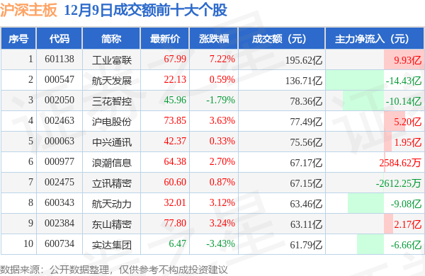 当日沪深主板成交额前10大个股中8只个股收涨,平均涨幅2.71%,其中工业富联(601138)以成交额195.62亿元排第一。从主力资金流入看,成交额前10大个股中有5只个股呈现主力资金净流入。