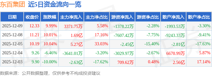 证券之星消息,截至2025年12月9日收盘,东百集团(600693)报收于12.33元,上涨9.99%,已连续涨停3天,换手率5.64%,成交量49.03万手,成交额6.05亿元。