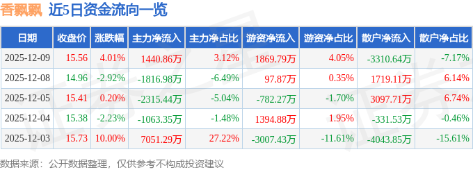 证券之星消息,截至2025年12月9日收盘,香飘飘(603711)报收于15.56元,上涨4.01%,换手率7.32%,成交量30.22万手,成交额4.62亿元。