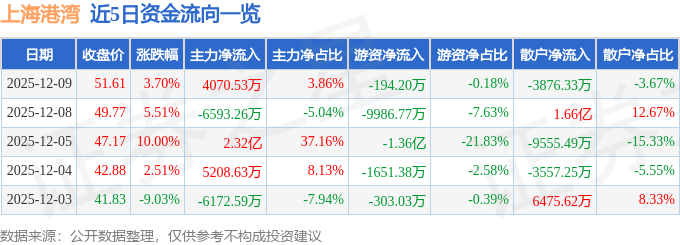 证券之星消息,截至2025年12月9日收盘,上海港湾(605598)报收于51.61元,上涨3.7%,换手率8.58%,成交量20.86万手,成交额10.55亿元。