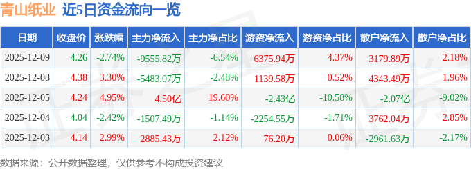 证券之星消息,截至2025年12月9日收盘,青山纸业(600103)报收于4.26元,下跌2.74%,换手率15.57%,成交量344.43万手,成交额14.6亿元。