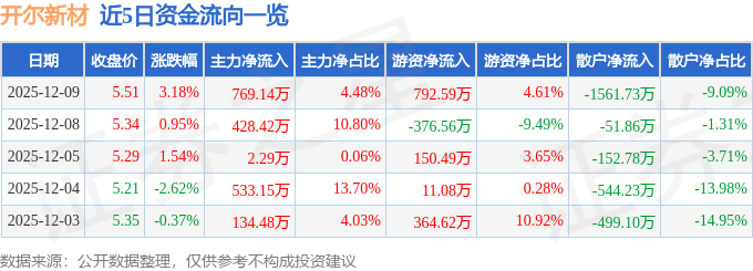 证券之星消息,截至2025年12月9日收盘,开尔新材(300234)报收于5.51元,上涨3.18%,换手率8.99%,成交量30.93万手,成交额1.72亿元。