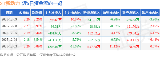 证券之星消息,截至2025年12月9日收盘,ST新动力(300152)报收于2.26元,上涨2.26%,换手率4.59%,成交量32.74万手,成交额7326.19万元。