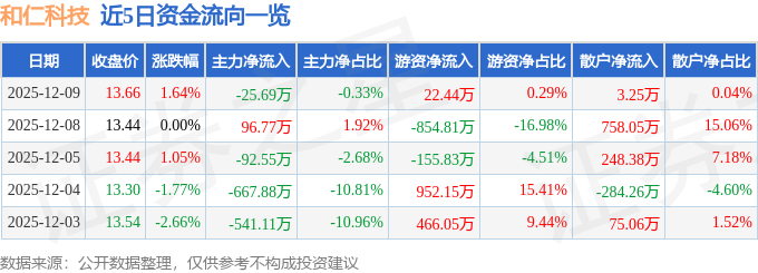 证券之星消息,截至2025年12月9日收盘,和仁科技(300550)报收于13.66元,上涨1.64%,换手率2.14%,成交量5.62万手,成交额7720.93万元。