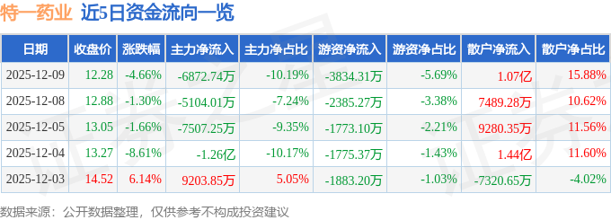 证券之星消息,截至2025年12月9日收盘,特一药业(002728)报收于12.28元,下跌4.66%,换手率14.39%,成交量54.24万手,成交额6.74亿元。