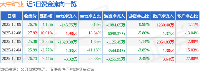 证券之星消息,截至2025年12月9日收盘,大中矿业(001203)报收于26.76元,下跌4.15%,换手率3.16%,成交量40.81万手,成交额11.05亿元。
