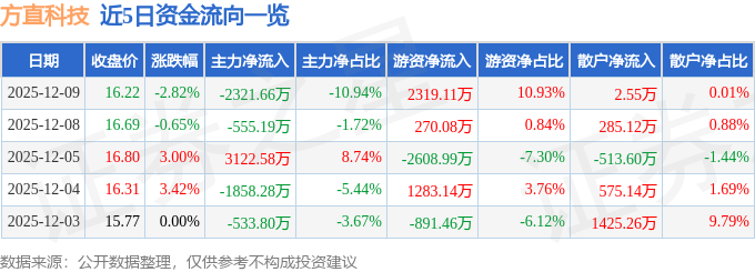 证券之星消息,截至2025年12月9日收盘,方直科技(300235)报收于16.22元,下跌2.82%,换手率6.34%,成交量12.88万手,成交额2.12亿元。