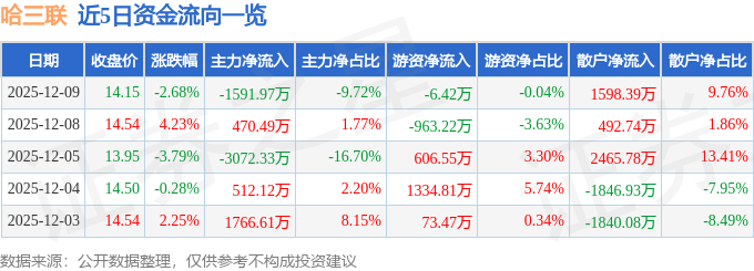证券之星消息,截至2025年12月9日收盘,哈三联(002900)报收于14.15元,下跌2.68%,换手率6.54%,成交量11.45万手,成交额1.64亿元。