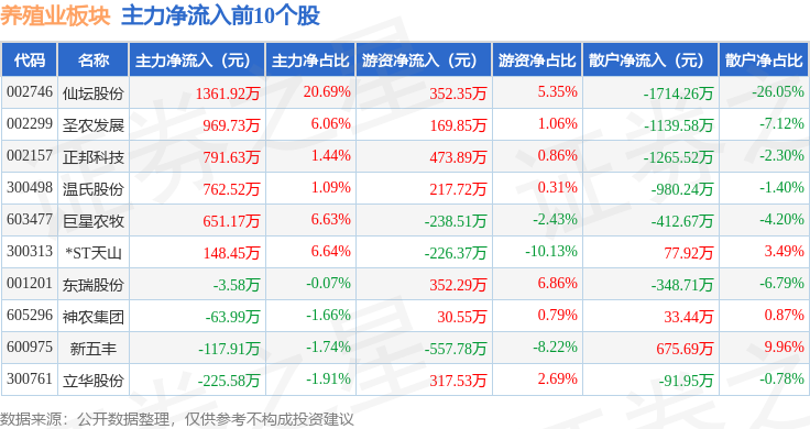 从资金流向上来看,当日养殖业板块主力资金净流出1.85亿元,游资资金净流入1.37亿元,散户资金净流入4798.47万元。养殖业板块个股资金流向见下表: