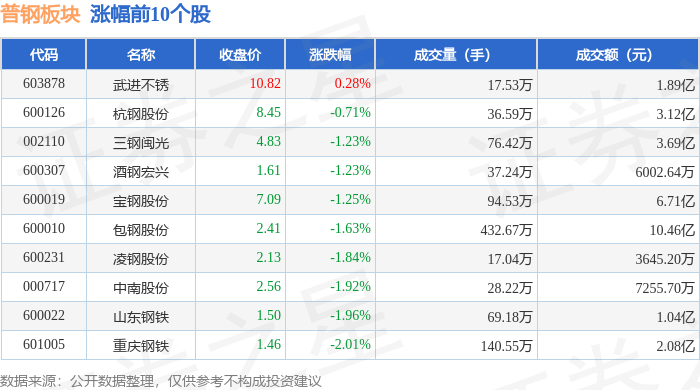 证券之星消息,12月9日普钢板块较上一交易日下跌2.2%,首钢股份领跌。当日上证指数报收于3909.52,下跌0.37%。深证成指报收于13277.36,下跌0.39%。普钢板块个股涨跌见下表: