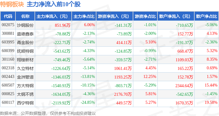 从资金流向上来看,当日特钢板块主力资金净流出1.78亿元,游资资金净流入3348.16万元,散户资金净流入1.44亿元。特钢板块个股资金流向见下表: