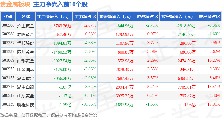从资金流向上来看,当日贵金属板块主力资金净流出9.68亿元,游资资金净流入2.65亿元,散户资金净流入7.03亿元。贵金属板块个股资金流向见下表: