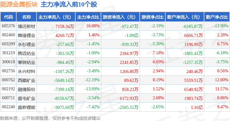 从资金流向上来看,当日能源金属板块主力资金净流出11.71亿元,游资资金净流入3.83亿元,散户资金净流入7.87亿元。能源金属板块个股资金流向见下表: