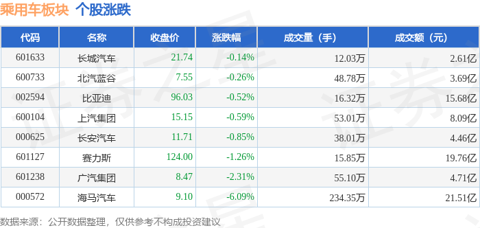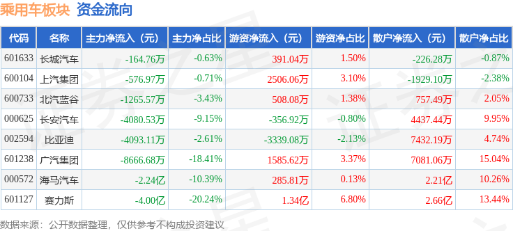 从资金流向上来看,当日乘用车板块主力资金净流出8.12亿元,游资资金净流入1.5亿元,散户资金净流入6.62亿元。乘用车板块个股资金流向见下表: