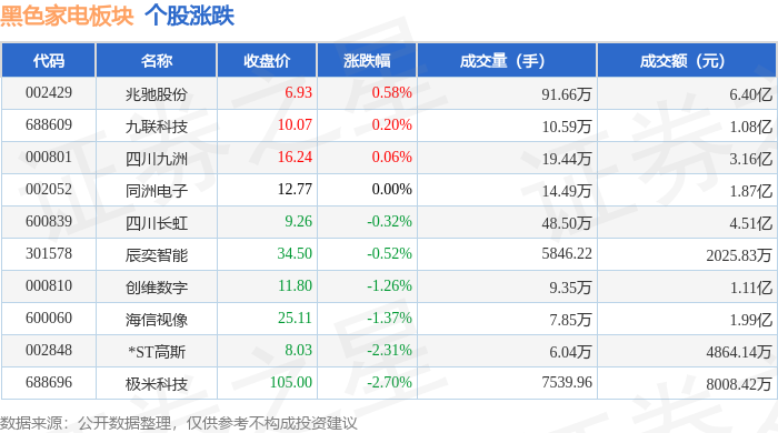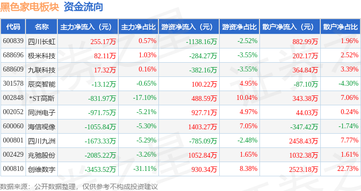 从资金流向上来看,当日黑色家电板块主力资金净流出9730.16万元,游资资金净流入2313.29万元,散户资金净流入7416.87万元。黑色家电板块个股资金流向见下表:
