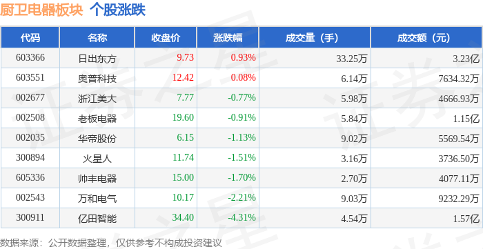证券之星消息,12月9日厨卫电器板块较上一交易日下跌1.17%,亿田智能领跌。当日上证指数报收于3909.52,下跌0.37%。深证成指报收于13277.36,下跌0.39%。厨卫电器板块个股涨跌见下表: