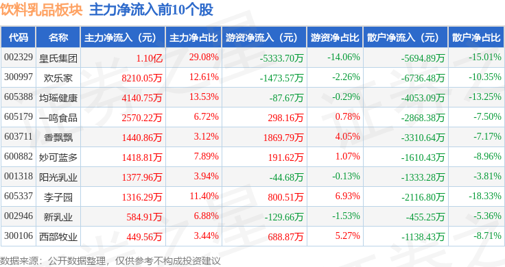 从资金流向上来看,当日饮料乳品板块主力资金净流入2.04亿元,游资资金净流入1682.44万元,散户资金净流出2.2亿元。饮料乳品板块个股资金流向见下表: