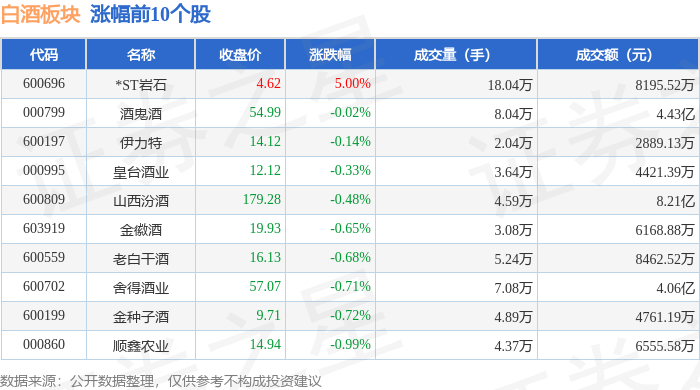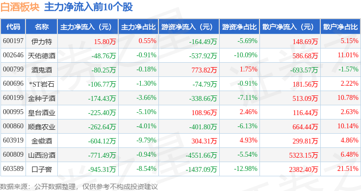 从资金流向上来看,当日白酒板块主力资金净流出22.54亿元,游资资金净流入13.11亿元,散户资金净流入9.43亿元。白酒板块个股资金流向见下表: