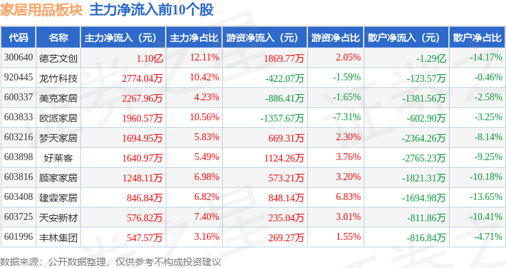 从资金流向上来看,当日家居用品板块主力资金净流出5990.27万元,游资资金净流入1.76亿元,散户资金净流出1.16亿元。家居用品板块个股资金流向见下表: