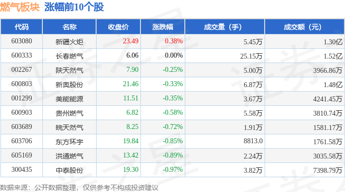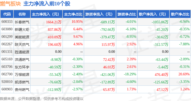 从资金流向上来看,当日燃气板块主力资金净流出3.45亿元,游资资金净流入2126.39万元,散户资金净流入3.23亿元。燃气板块个股资金流向见下表: