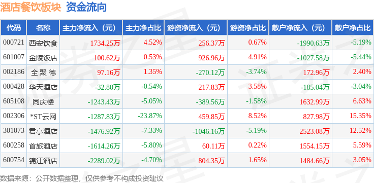 从资金流向上来看,当日酒店餐饮板块主力资金净流出6012.23万元,游资资金净流入1019.64万元,散户资金净流入4992.59万元。酒店餐饮板块个股资金流向见下表: