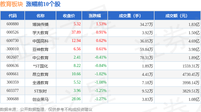 证券之星消息,12月9日教育板块较上一交易日下跌0.65%,科德教育领跌。当日上证指数报收于3909.52,下跌0.37%。深证成指报收于13277.36,下跌0.39%。教育板块个股涨跌见下表: