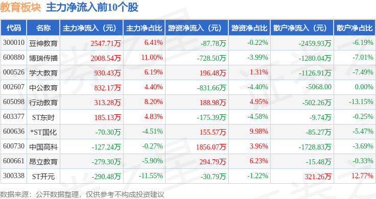 从资金流向上来看,当日教育板块主力资金净流出7817.3万元,游资资金净流出6724.81万元,散户资金净流入1.45亿元。教育板块个股资金流向见下表: