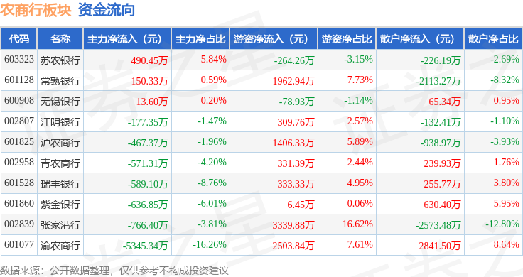 从资金流向上来看,当日农商行板块主力资金净流出7899.34万元,游资资金净流入9850.72万元,散户资金净流出1951.38万元。农商行板块个股资金流向见下表: