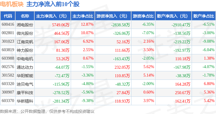 从资金流向上来看,当日电机板块主力资金净流出8.28亿元,游资资金净流入1.59亿元,散户资金净流入6.69亿元。电机板块个股资金流向见下表: