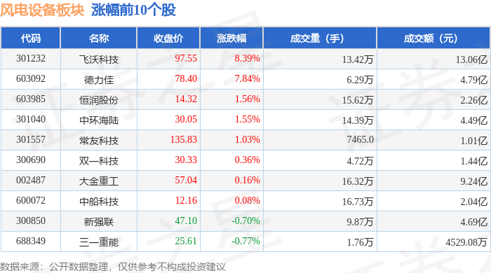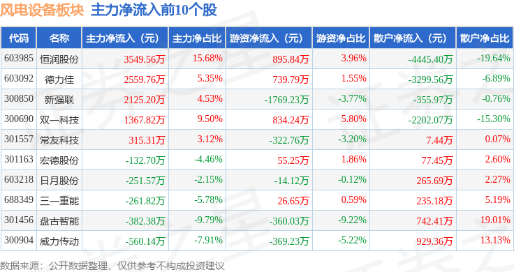 从资金流向上来看,当日风电设备板块主力资金净流出6.24亿元,游资资金净流入5149.19万元,散户资金净流入5.73亿元。风电设备板块个股资金流向见下表: