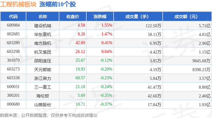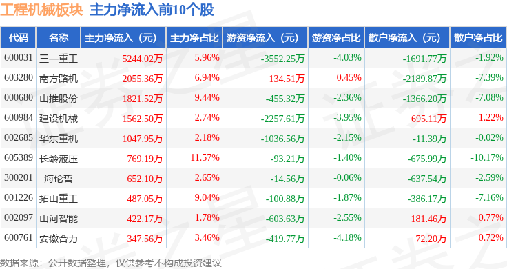 从资金流向上来看,当日工程机械板块主力资金净流出2.28亿元,游资资金净流出1204.37万元,散户资金净流入2.4亿元。工程机械板块个股资金流向见下表: