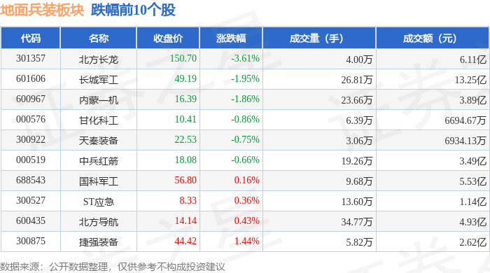 证券之星消息,12月9日地面兵装板块较上一交易日下跌0.39%,北方长龙领跌。当日上证指数报收于3909.52,下跌0.37%。深证成指报收于13277.36,下跌0.39%。地面兵装板块个股涨跌见下表: