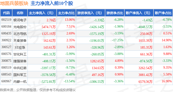 从资金流向上来看,当日地面兵装板块主力资金净流出3661.1万元,游资资金净流出1.96亿元,散户资金净流入2.33亿元。地面兵装板块个股资金流向见下表: