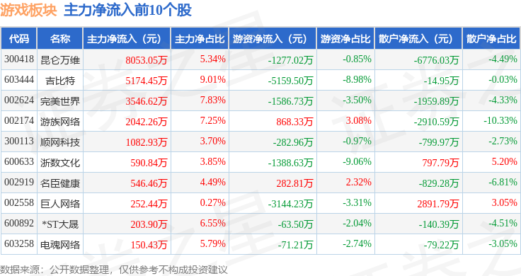 从资金流向上来看,当日游戏板块主力资金净流出1.95亿元,游资资金净流出748.88万元,散户资金净流入2.02亿元。游戏板块个股资金流向见下表: