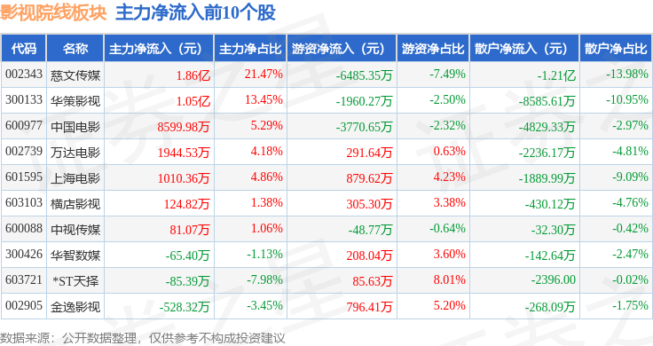 从资金流向上来看,当日影视院线板块主力资金净流入1508.55万元,游资资金净流出1324.58万元,散户资金净流出183.97万元。影视院线板块个股资金流向见下表: