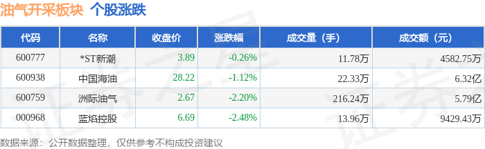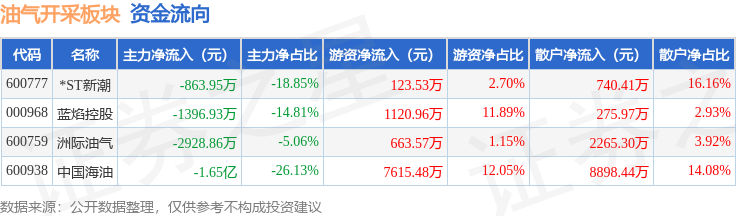 从资金流向上来看,当日油气开采板块主力资金净流出2.17亿元,游资资金净流入9523.54万元,散户资金净流入1.22亿元。油气开采板块个股资金流向见下表: